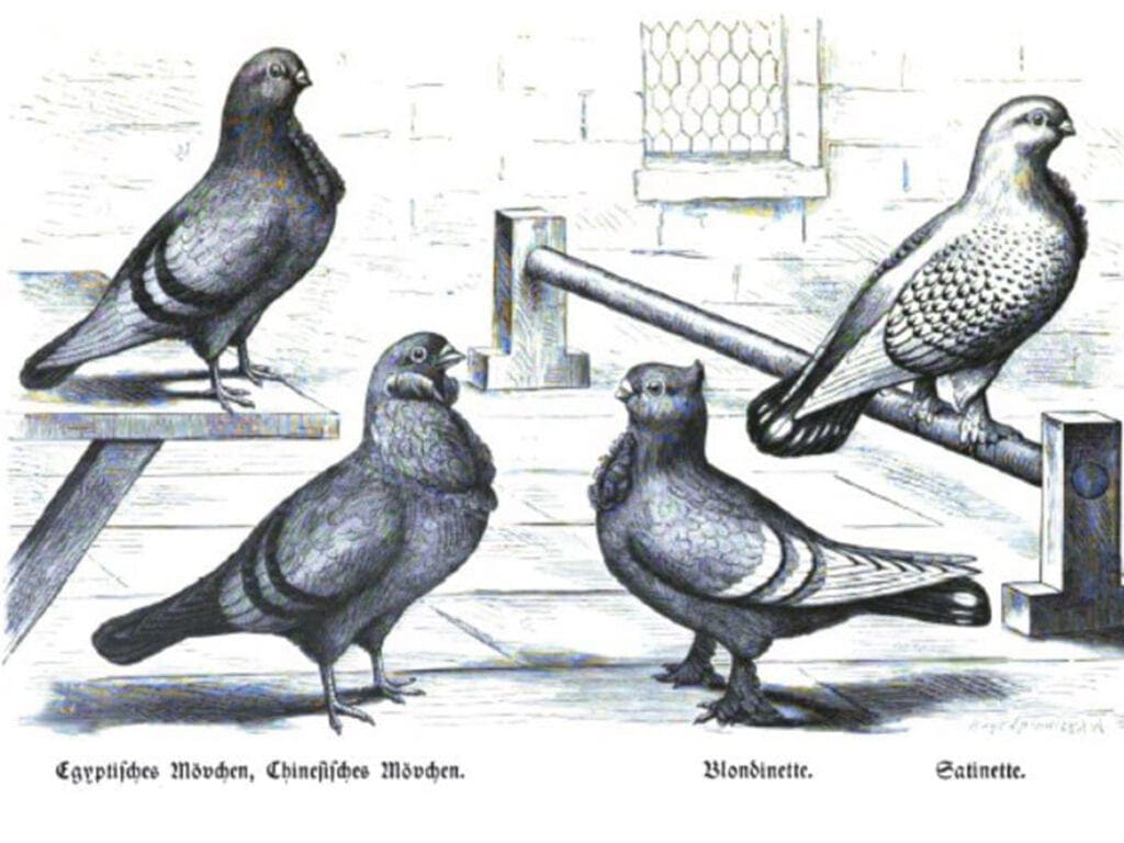 Die Mövchen bildeten Gruppe 4, die Pfautauben Gruppe 5 und die „Hühnertauben“ die 6. Gruppe. Darauf folgten die Kropftauben als 7. Gruppe und als 8. die Montauban. In der Gruppe 9 wurden „Römische Tauben, incl. der sogenannten Spanischen“ aufgeführt. In der abschließenden 10 Gruppe wurden die „Orientalischen Tauben“ zusammengefasst. Darunter fielen unter anderem alle Bagdetten und Warzentauben.