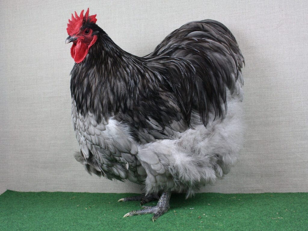 Es ist dabei die Feder, die die Wirkung verleiht. Darunter verbirgt sich ein kräftiges Huhn mit ausreichend Fleischansatz. Im Gefieder verborgen liegen die kräftigen Schenkel. Zu sehen sind hingegen die mittellangen Läufe, zumindest etwas.